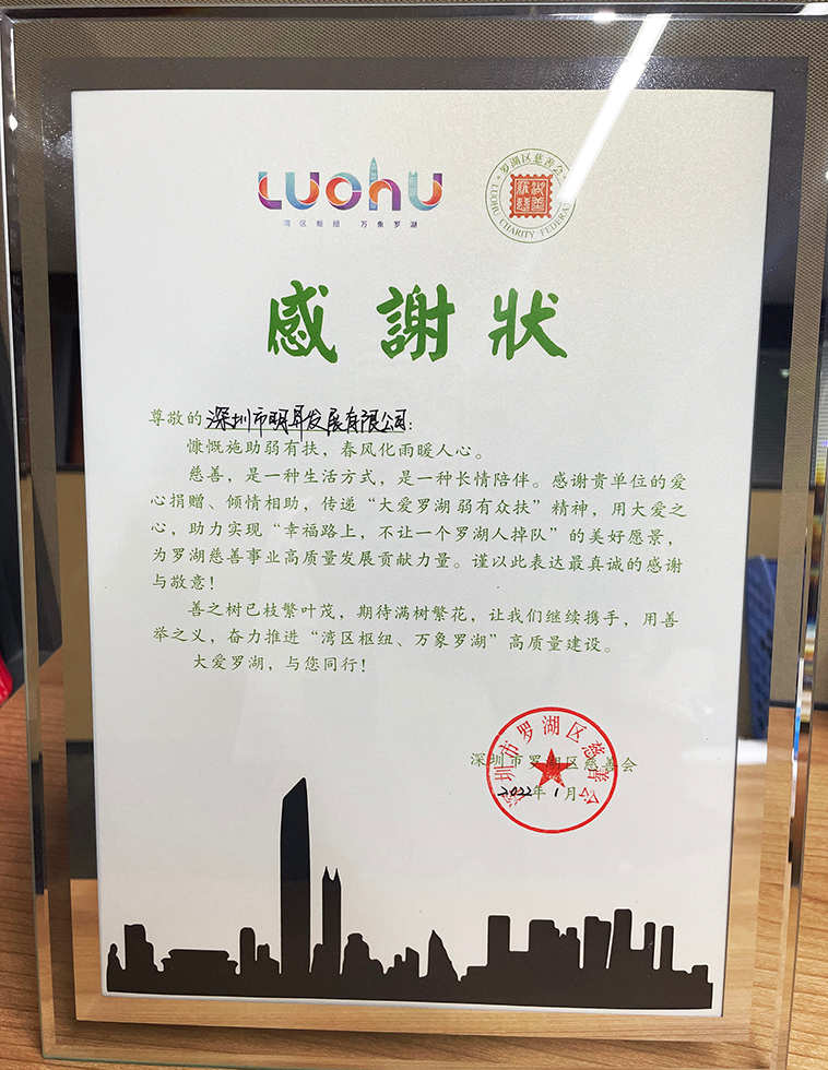 2022年度榮獲深圳市羅湖區(qū)慈善會頒發(fā)感謝狀